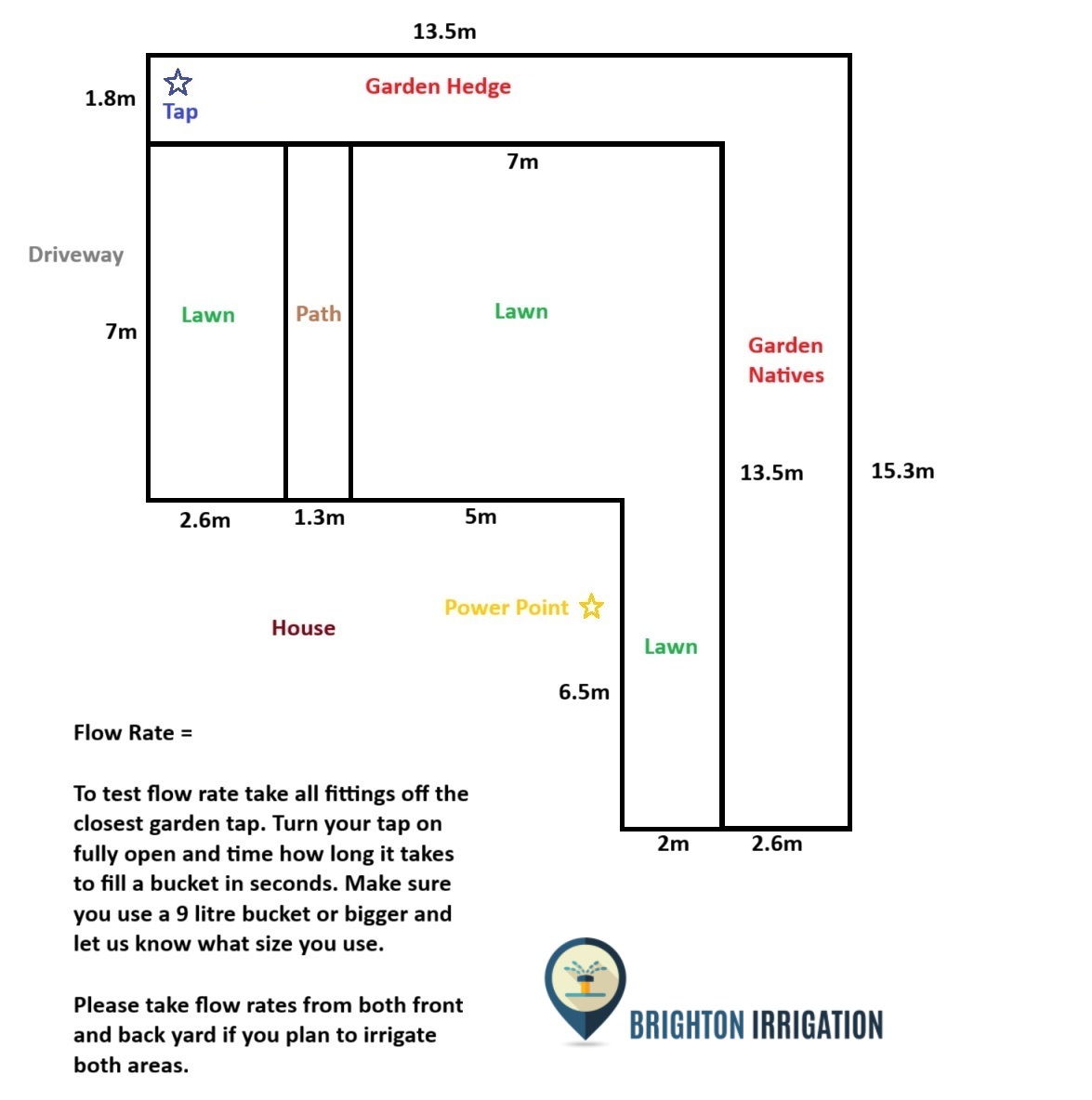 Time how long it takes to fill a bucket (in seconds) using a 9-litre bucket or bigger. The tap should be the closest one to the water source you plan to connect your irrigation system to. Take any fittings or hoses off the tap and fully open before placing the bucket under tap, with no other taps or valves in use. Make sure you take a flow rate from the front and backyard if you plan on irrigating both areas.